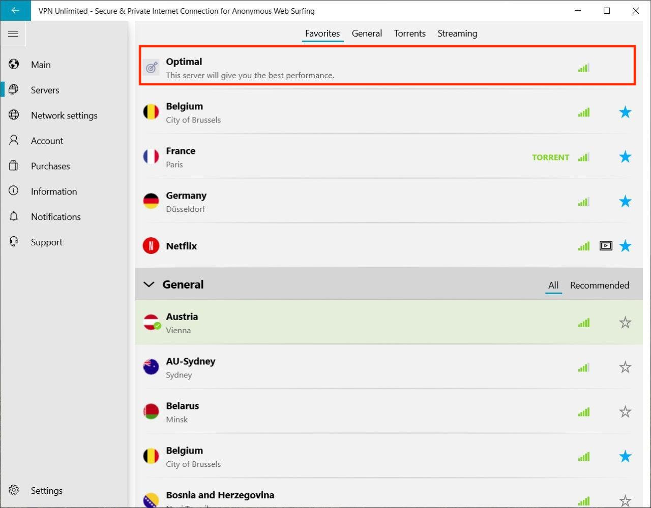 - Además, en la parte superior de las pestañas Favorites (Favoritos) (y All servers (Todos los servidores)), encontrará la opción de servidor Optimal (Óptimo). La activación de esta función permite que la aplicación elija automáticamente un servidor virtual adecuado que ofrecerá el mejor rendimiento.