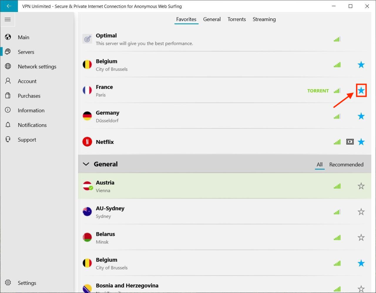 - Favorites (Favoritos): Su lista personalizada de ubicaciones VPN preferidas. Haga clic en el icono de estrella junto a cualquier servidor para agregarlo aquí para un acceso rápido.