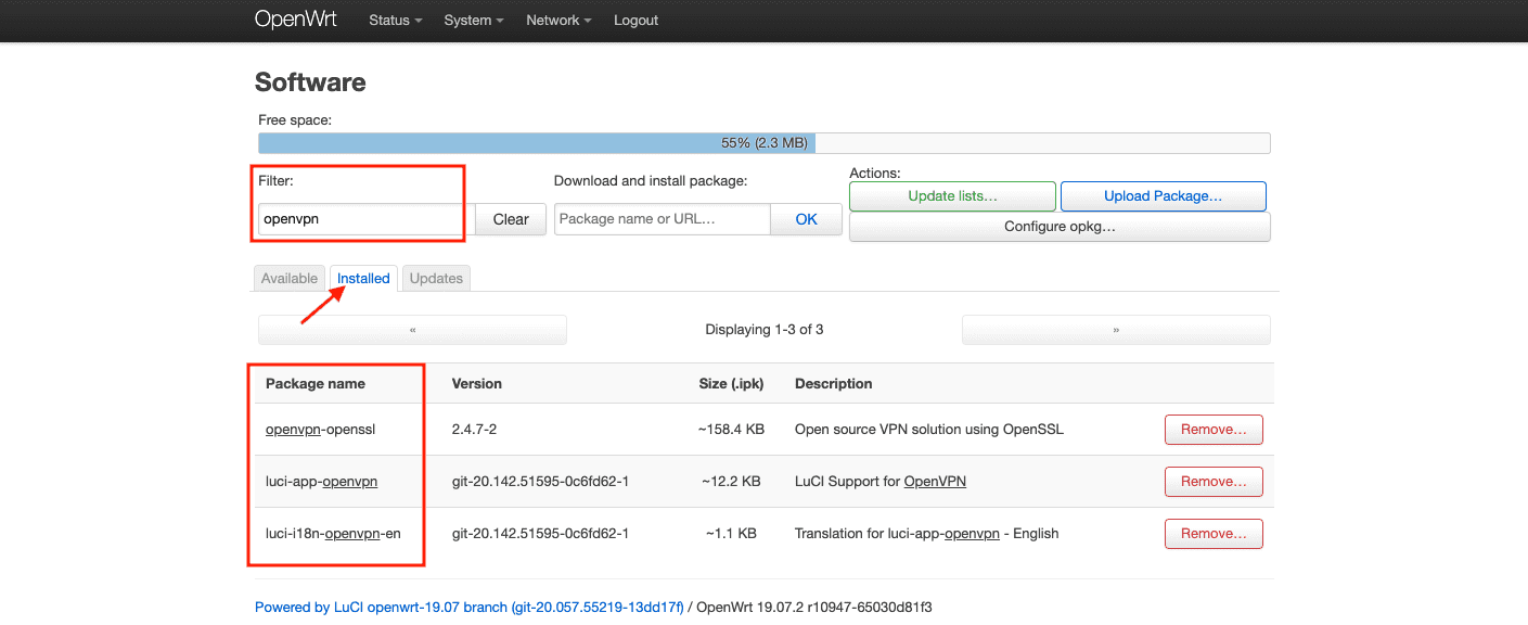 - Assurez-vous que tous les packages ont été installés avec succès. Pour ce faire, sélectionnez l'onglet Installed (Installé) et tapez openvpn dans le champ Filter (Filtre).