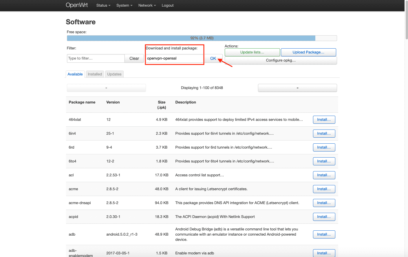 - Tapez openvpn-openssl dans le champ Download and install package (Téléchargez et installez le package) et appuyez sur OK.