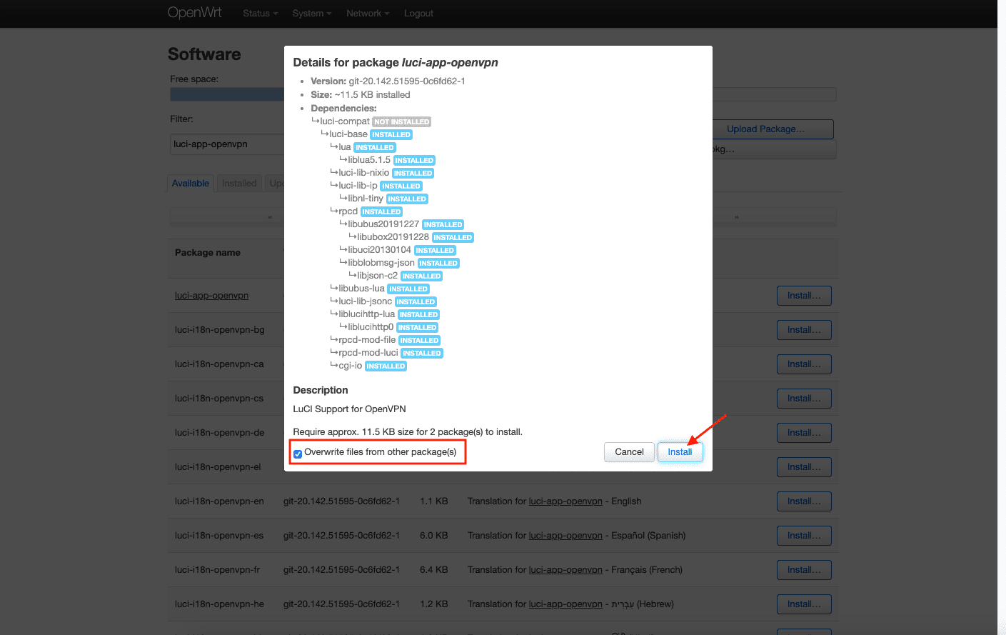 - Tapez luci-app-openvpn dans le champ Filter (Filtre) et cliquez sur Install (Installer).