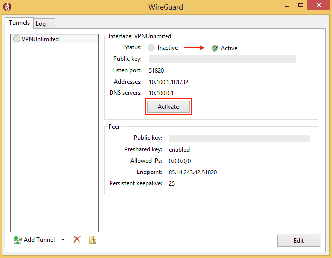 - Activate(アクティベート)ボタンを押してください。これで、安全なWireGuard VPN接続が確立されました。