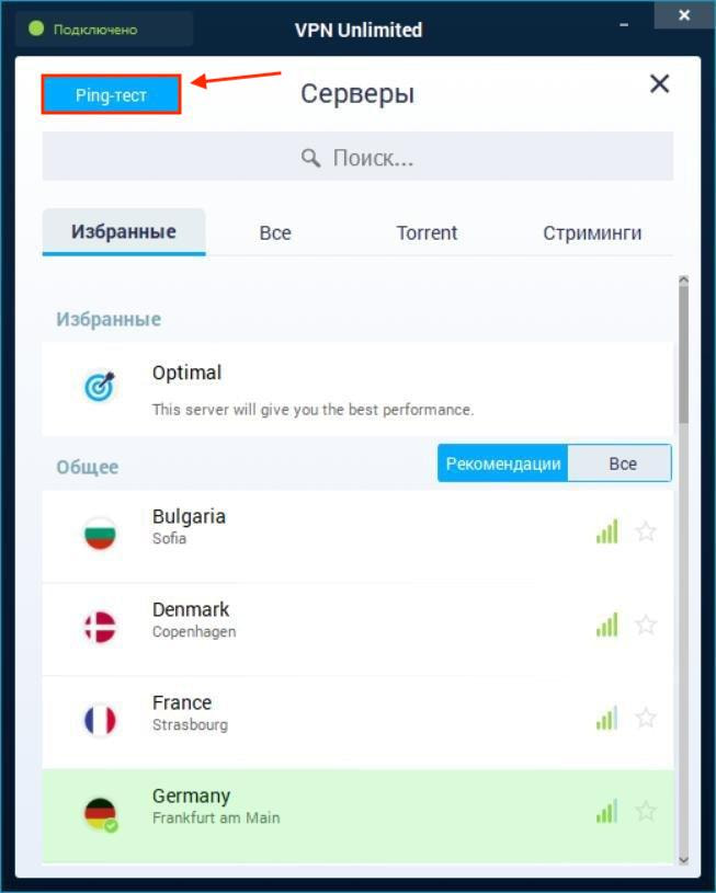 В левом верхнем углу экрана Серверы находится кнопка Ping-тест. Данный тест показывает за какое время между вашим устройством и нашими VPN серверами произошел обмен информацией. Полученные результаты помогут вам в выборе подходящего VPN сервера. Чем меньше времени было затрачено на передачу информации, тем скорость соединения будет выше.