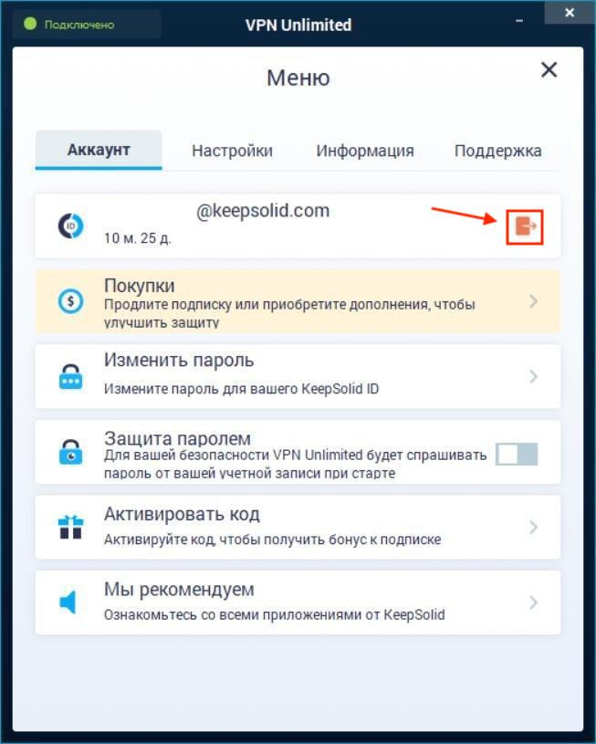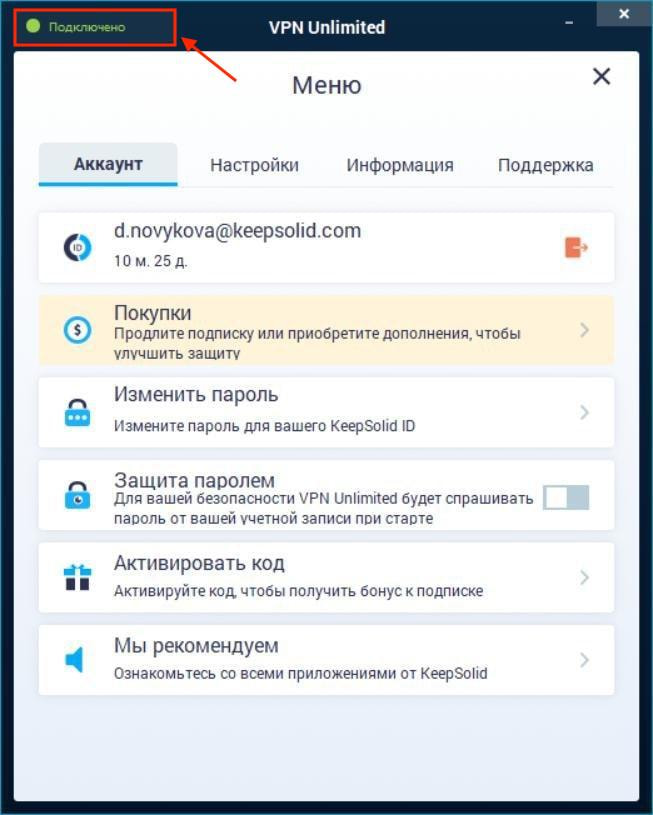 - Информация о вашем KeepSolid ID: адрес электронной почты, на которую зарегистрирована ваша учетная запись и оставшийся период вашей подписки.