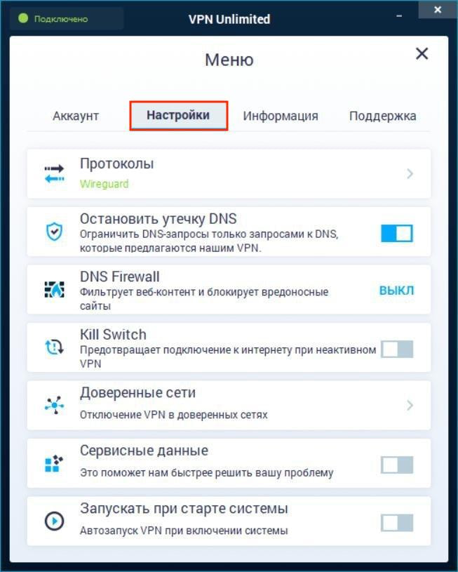 3. Какие параметры можно настроить в Меню Windows VPN клиента от KeepSolid