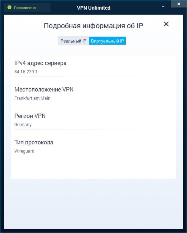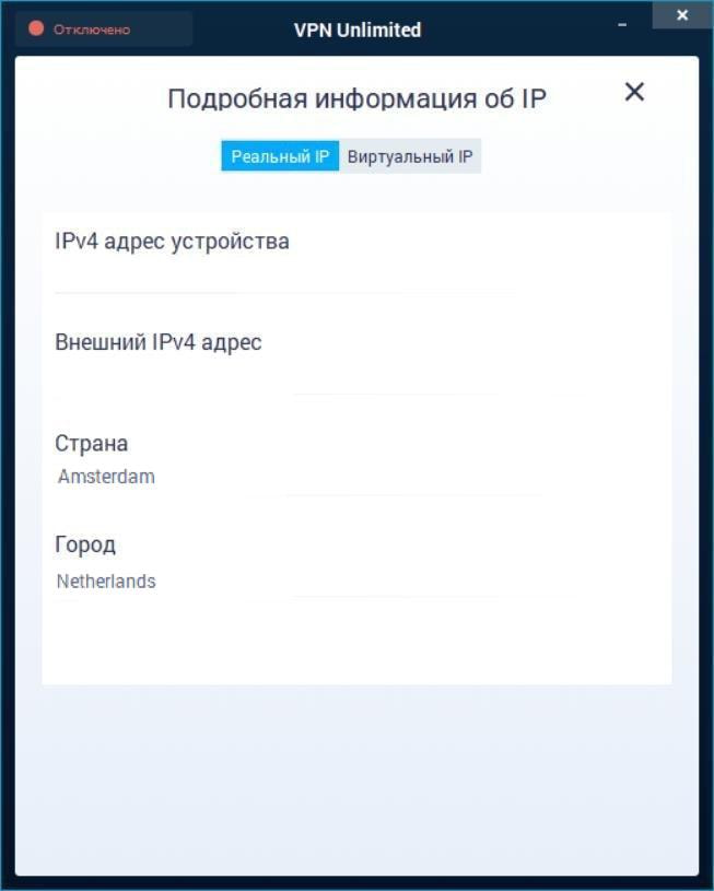 Также на главном экране вы можете увидеть карту, которая отображает ваш реальный и виртуальный IP адрес. Чтобы увидеть более подробную информацию, нажмите на синие и зеленое поле соответственно.